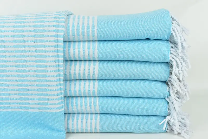 Türkische Baumwolle zeichnet sich durch hervorragende Saugfähigkeit und schnell trocknende Eigenschaften aus. Um Weichheit und Haltbarkeit zu gewährleisten, werden diese Handtücher auf traditionellen Handwebstühlen gewebt, was zu einem Gewicht von etwa 250 Gramm und Abmessungen von 40 x 71 Zoll oder 100 x 180 cm mit einer Toleranz von 1–2,5 cm führt.