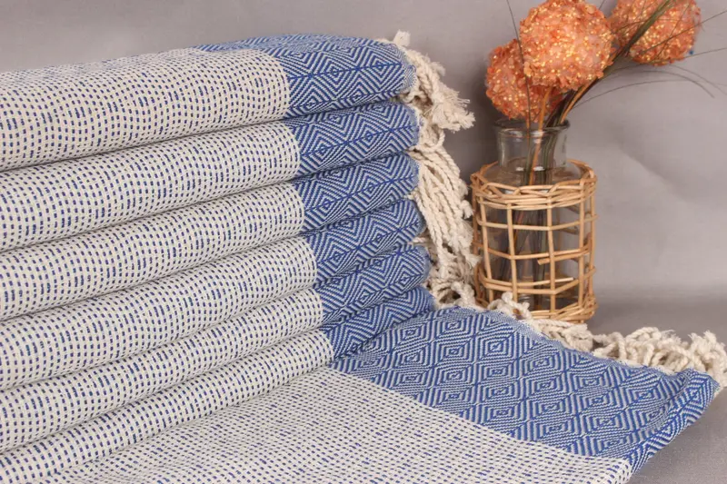 Bio-Baumwollgarn zeichnet dieses türkische Handtuch aus und sorgt für eine hohe Saugfähigkeit und Haltbarkeit. Das Ergebnis ist ein leichter, flachgewebter Stoff, der für verschiedene Zwecke vielseitig einsetzbar ist. Die Handtuchabmessungen umfassen 100 x 180 cm (40 x 71 Zoll) mit einer Toleranz von 5 cm (2 Zoll). Mit einem Gewicht von 380 Gramm bietet es eine weiche Textur, die mit jedem Waschen noch weicher wird.
