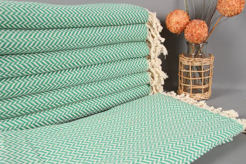 Türkische Badetücher werden aus Bio-Baumwollgarn gewebt, was eine hochwertige Saugfähigkeit und Haltbarkeit gewährleistet. Daraus ergibt sich ein Gewicht von 450 Gramm, die Handtücher haben Abmessungen von 40x71 Zoll (100x180 Zentimeter) bei einer Webtoleranz von bis zu 2 Zoll (5 Zentimeter).