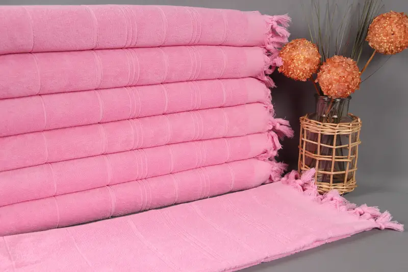 Dieses sorgfältig aus türkischer Baumwolle gefertigte Produkt sorgt für Haltbarkeit und Weichheit. Das Frotteehandtuch zeichnet sich durch sein hellrosa und beige gestreiftes Design aus und misst 18 x 40 Zoll, was 45 x 100 Zentimetern entspricht, mit einer Toleranz von bis zu 5 Zentimetern. Jedes Handtuch wiegt 100 Gramm und wird mit präzisen Handwebtechniken hergestellt.