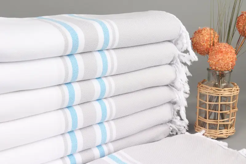 Das türkische Handtuch besteht aus Bio-Baumwollgarn, das Haltbarkeit und Atmungsaktivität gewährleistet. Es misst 40 x 71 Zoll (100 x 180 cm) mit einer Toleranz von 2 Zoll (5 cm) aufgrund der Handwebtechnik und wiegt 304 Gramm. Das Ergebnis ist ein leichter Mehrzweckartikel, der für verschiedene Haushaltszwecke geeignet ist.