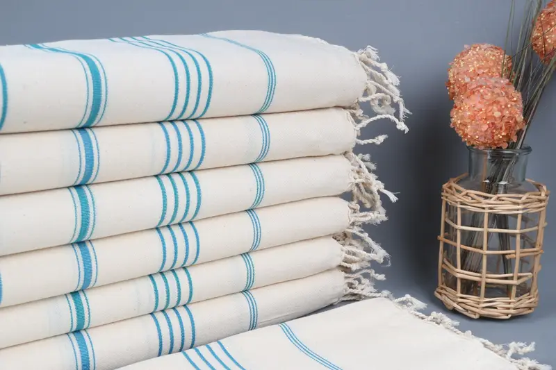 Handgefertigte türkische Strandtücher bestehen aus 100 % Bio-Baumwollgarn und sorgen für hervorragende Weichheit und Saugfähigkeit. Das Ergebnis ist ein Handtuch mit einer Größe von 100 x 180 cm (40 x 71 Zoll) und einem Gewicht von 280 Gramm. Diese Handtücher ermöglichen bei Webvarianten einen Spielraum von bis zu 5 cm (2 Zoll). Sie zeichnen sich durch ein reversibles Design aus und sind vielseitig einsetzbar, geeignet für Küche, Bad und Reisen.