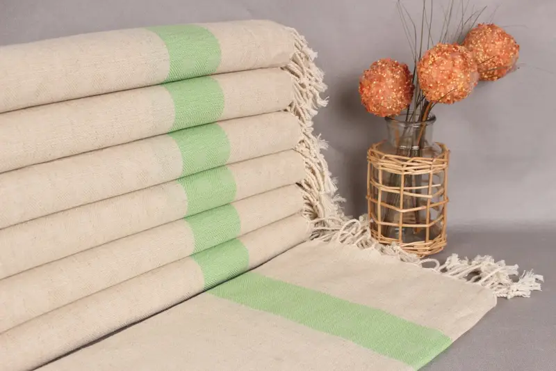 Das türkische Handtuch ist aus Bio-Baumwollgarn gefertigt und sorgt für Atmungsaktivität und Haltbarkeit. Es zeichnet sich durch seine Abmessungen von 36 x 71 Zoll (90 x 180 Zentimeter) mit einer Toleranz von 2 Zoll (5 Zentimeter) aus und wiegt 280 Gramm. Dieses handgewebte Handtuch weist die Variabilität auf, die der handwerklichen Produktion innewohnt.