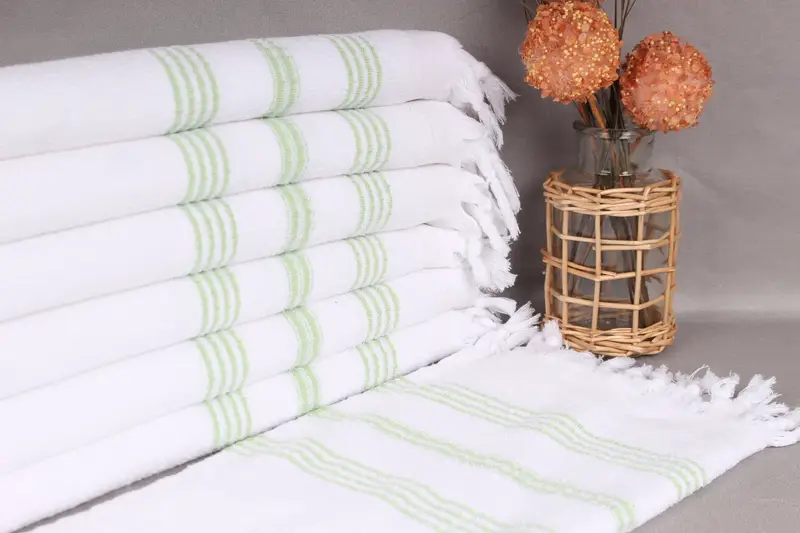 Dieses pistaziengrün gestreifte Baumwollgeschirrtuch wird ausschließlich aus hochwertigem türkischem Bio-Baumwollgarn gewebt und zeichnet sich durch seine hervorragende Saugfähigkeit und Haltbarkeit aus. Die Faserzusammensetzung sorgt für ein luxuriöses Gefühl und unterstreicht die weiche Textur des Handtuchs, sodass es sich ideal für verschiedene Verwendungszwecke eignet.