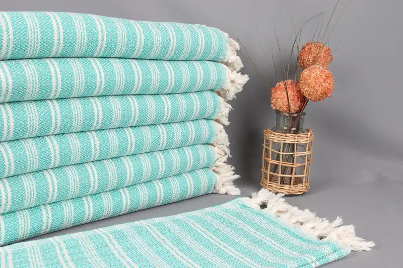 Das türkische Handtuch ist aus Bio-Baumwollgarn gewebt und sorgt so für Langlebigkeit und Umweltfreundlichkeit. Die Abmessungen betragen 45 x 80 cm (18 x 32 Zoll) bei einem Gewicht von 120 Gramm. Webtoleranzen ermöglichen Abweichungen von bis zu 5 cm.