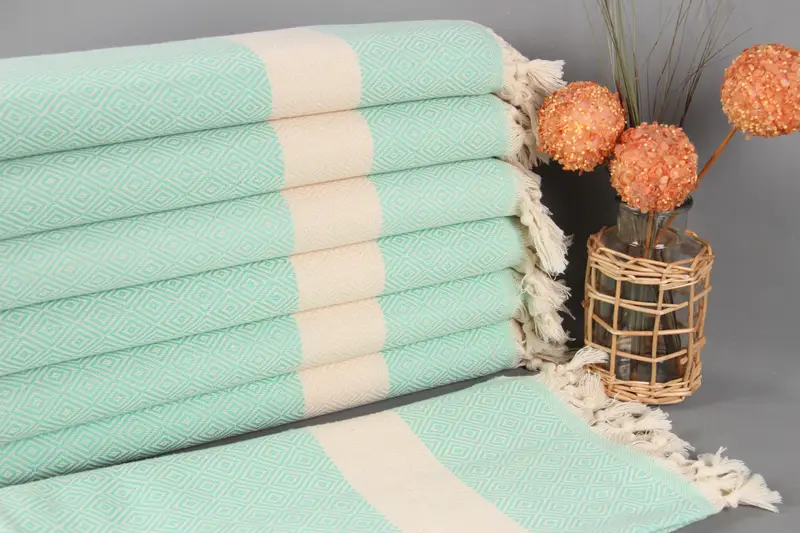 Webtechniken sorgen dafür, dass türkische Handtücher aus Bio-Baumwollgarnen sehr saugfähig sind, was zu einer verbesserten Funktionalität führt. Die Abmessungen betragen 50 x 90 Zentimeter (20 x 36 Zoll) mit einer Toleranz von ±1–2,5 cm aufgrund von Handwebabweichungen. Das Handtuch wiegt 115 Gramm und bietet ein Gleichgewicht zwischen Leichtigkeit und Haltbarkeit.