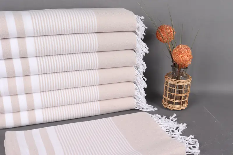 Hergestellt aus Bio-Baumwollgarn, das eine hervorragende Saugfähigkeit und Atmungsaktivität gewährleistet. Jedes türkische Strandtuch misst 40 x 71 Zoll, was 100 x 180 Zentimetern entspricht, mit einer Toleranz von 2,5 cm aufgrund der Handwebtechnik. Das Gewicht des Handtuchs beträgt 280 Gramm und bietet ein ausgewogenes Verhältnis zwischen Tragbarkeit und Funktionalität.