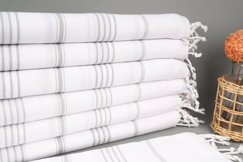 Dieses türkische Handtuch gewährleistet Komfort und Haltbarkeit und ist aus hochwertigem Bio-Baumwollgarn gewebt, das sich durch seine dichte Faserzusammensetzung und hervorragende Saugfähigkeit auszeichnet. Jedes Handtuch misst 100 x 180 Zentimeter (40 x 71 Zoll) und wiegt etwa 300 Gramm. Handwebtechniken führen zu Größentoleranzen von bis zu 5 Zentimetern.