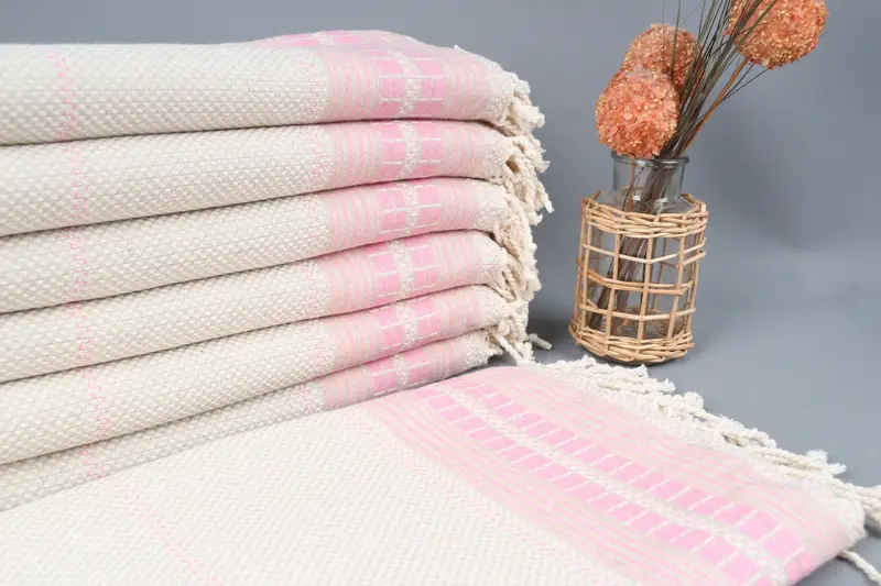 Türkische Handtücher zeichnen sich durch eine hervorragende Saugfähigkeit aus und sorgen für eine effektive Wasserspeicherung und schnelle Trocknungsfähigkeit. Diese Handtücher zeichnen sich durch ihre Zusammensetzung aus Bio-Baumwollfasern aus und bieten Strapazierfähigkeit und einen weichen Griff, wodurch sie sich ideal für verschiedene Haushaltsanwendungen eignen. Die Handtuchabmessungen betragen 95 x 165 Zentimeter (38 x 65 Zoll) mit einer Toleranz von 1–2,5 cm und wiegen 420 Gramm, was reichlich Nutzen für verschiedene Verwendungszwecke bi...