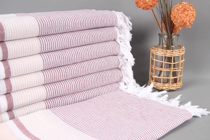 Gesticktes Strandtuch mit individuellem türkischem Beige-Burgunder-Streifen, 40 x 67 Zoll