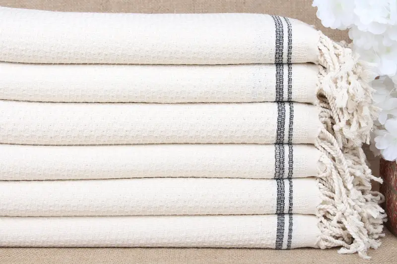 Die Abmessungen der Handtücher betragen 67 x 36 Zoll, was einer Größe von 170 x 90 Zentimetern entspricht. Durch die leichte Bauweise sind sie für verschiedene Anwendungen geeignet. Aufgrund der handwerklichen Beschaffenheit sind gerin...