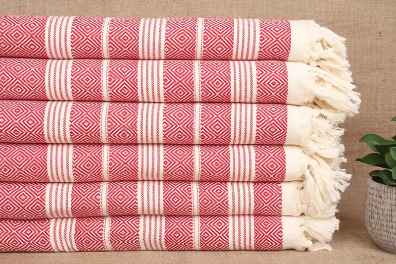 Die angegebenen Abmessungen betragen 38 x 69 Zoll, was 95 x 175 cm entspricht. Jedes Stück hat eine Handwebtoleranz von ±2 Zoll oder 5 cm. Um Präzision zu gewährleisten, sind die Handtücher doppelseitig gestrick...