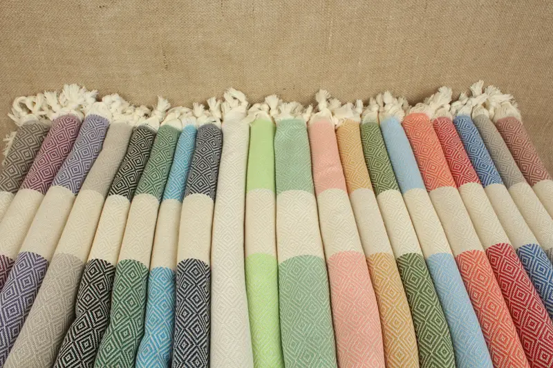 Türkische Handtücher zeugen von höchster Handwerkskunst und zeichnen sich durch ihre Zusammensetzung aus reiner Bio-Baumwolle aus, die eine außergewöhnliche Saugfähigkeit und schnelles Trocknen gewährleistet. Diese Handtücher sind ein leichtes, umweltfreundliches Produkt und haben die Maße 40 x 70 Zoll oder 100 x 180 Zentimeter für Handtücher und 20 x 36 Zoll oder 50 x 90 Zentimeter für kleinere Handtücher. Das Gewicht dieser Handtücher liegt zwischen etwa 420 Gramm und 120 Gramm, mit Webtoleranzen von ±2 Zoll oder 5 Zentimetern.