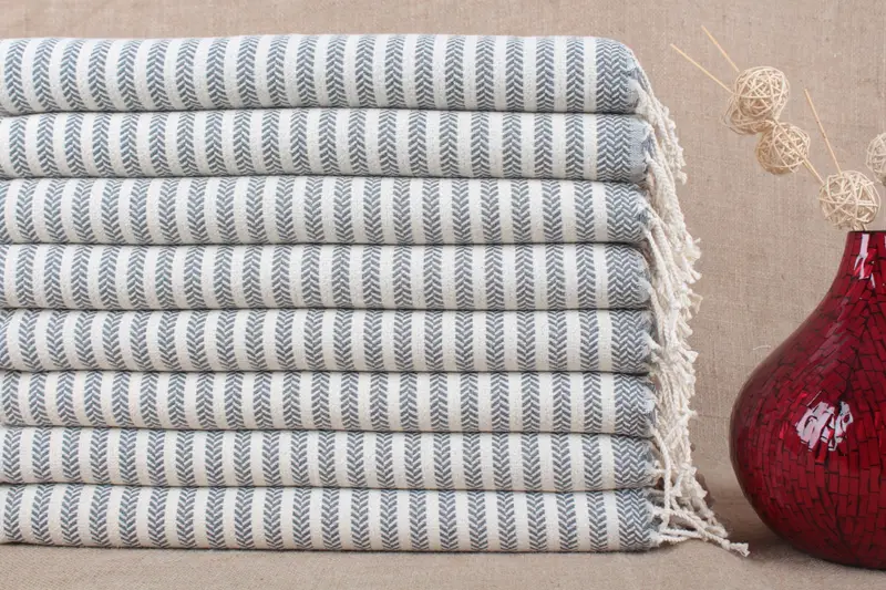 Türkische Handtücher zeichnen sich durch ihre Zusammensetzung aus reiner Bio-Baumwolle aus, die eine hohe Saugfähigkeit und schnelles Trocknen gewährleistet. Das Material des Handtuchs besteht aus 100 % türkischem Baumwollgarn und hat ein Gewicht von ca. 114 Gramm. Die Abmessungen des Handtuchs betragen 18 x 36 Zoll oder 45 x 90 Zentimeter mit einer Toleranz von ±2 Zoll oder 5 Zentimetern aufgrund der Handweberei.