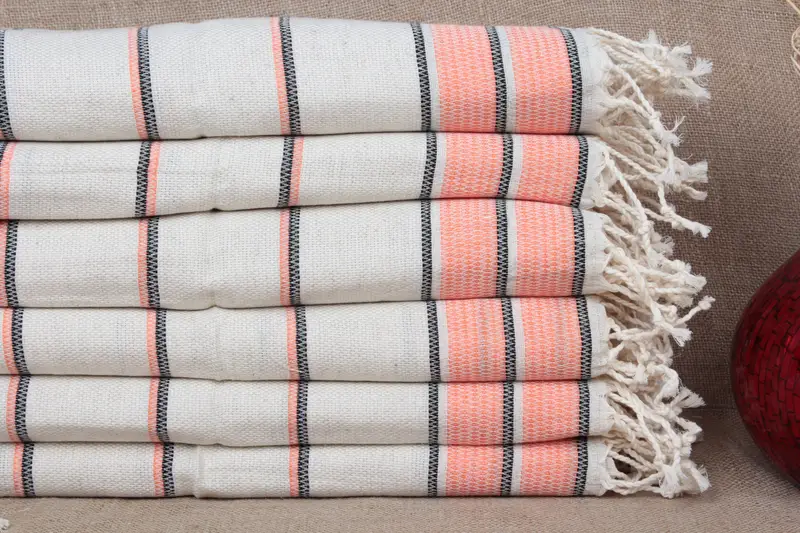 Türkisches Geschirrtuch, orange gestreiftes Leinen-Peshkir, bestickt, 20 x 40 Zoll