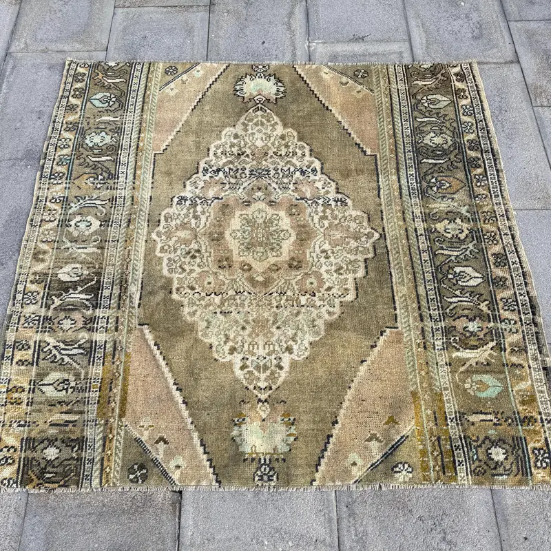Green Moroccan Rug, 3,9x3,7 ft Elegant Beige Accent