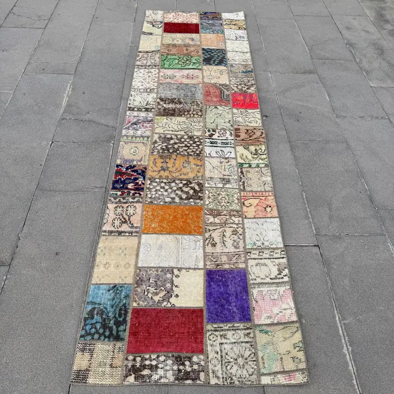 Brown Patchwork Rug, 2.5x8.6 ft Beige Accent