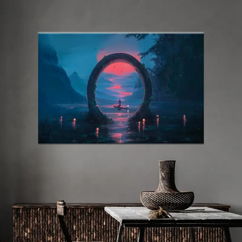 Abstract Boat Canvas: Night Landscape with Floating Lights