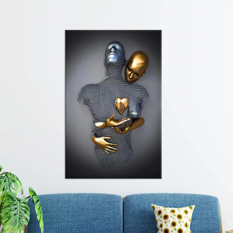 Modern Silver Luxury Canvas: Hugging Couple with Gold Heart