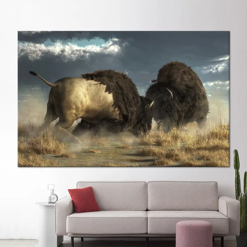 Majestic Bison Battle Canvas Print: Wild Nature Art