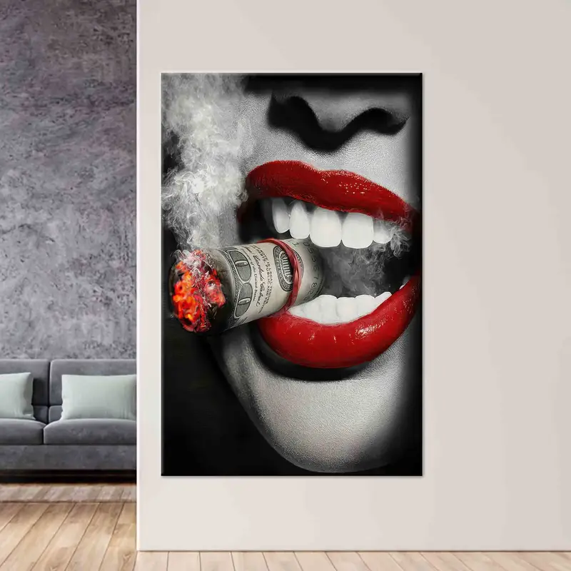 Elegant Canvas: Smoking Woman with Money Cigar & Red Lip