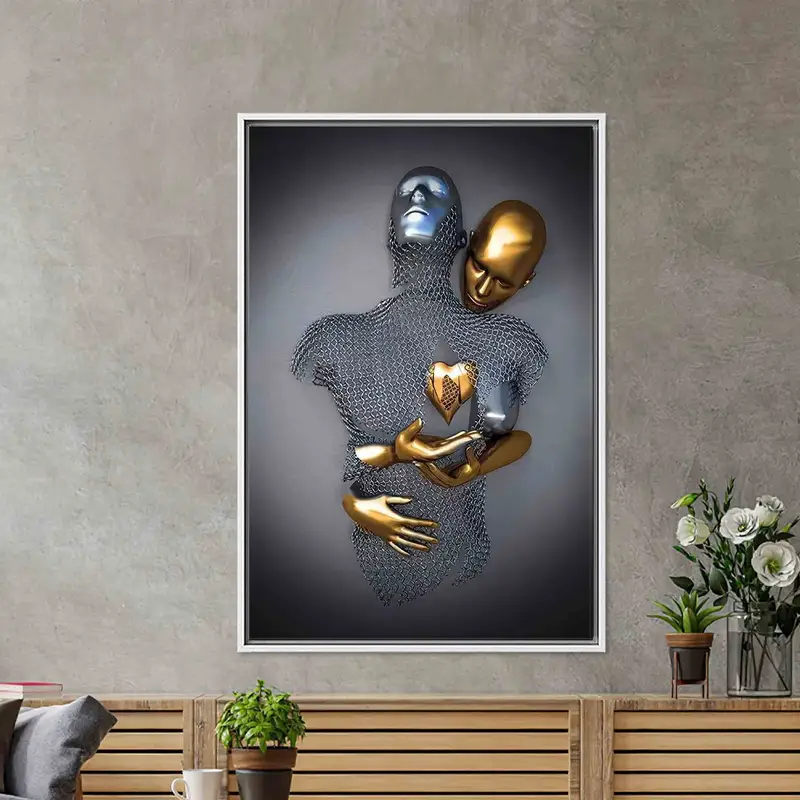 Modern Luxury Silver Canvas: Hugging Couple with Gold Heart