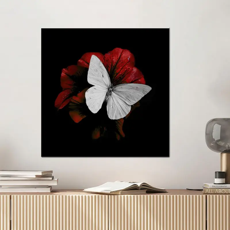 Modern Luxury Canvas: White Butterfly, Red Flower, Black