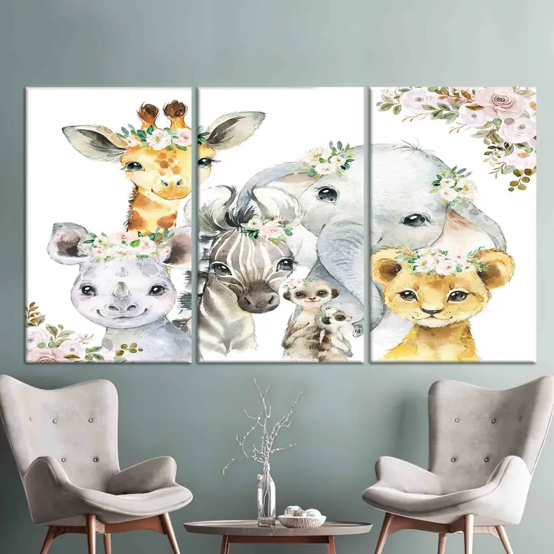 Modern Jungle Animals Printed Canvas: Giraffe, Elephant, Zebra