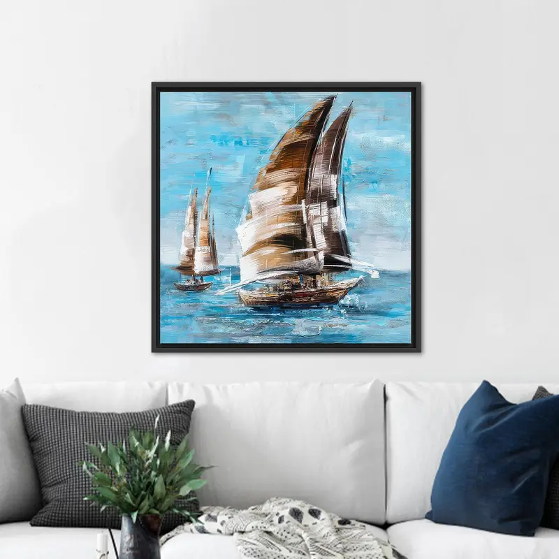 Modern Coastal Canvas: Blue Sea Landscape Boat Print