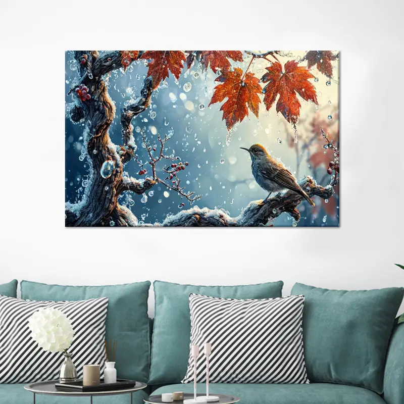 Elegant Canvas Print: Bird on Branch with Water Drops