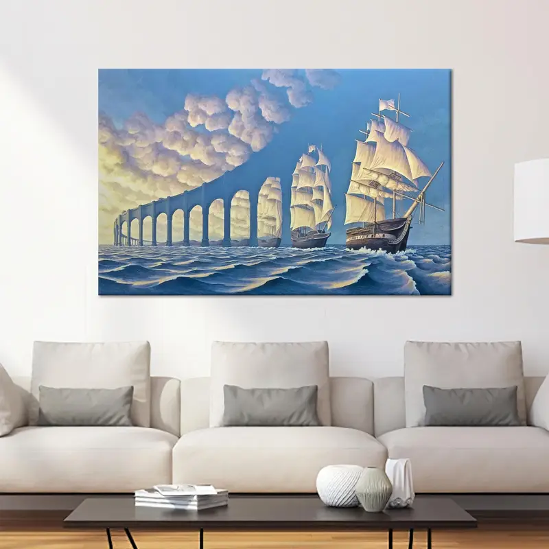 Surreal Sea Abstract Blue Canvas: Ship Voyage Art Print