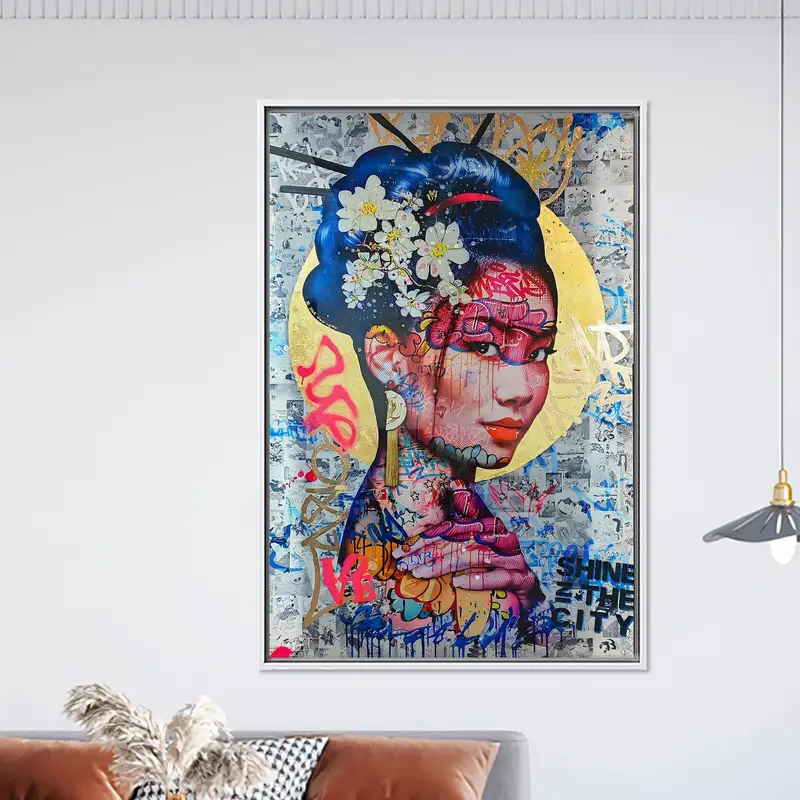 Elegant Banksy Geisha Printed Canvas: Modern Graffiti Art