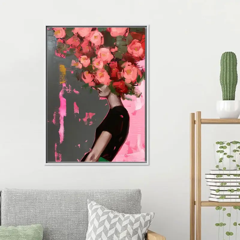 Elegant Floral Woman Canvas: Pink & Red Abstract Art
