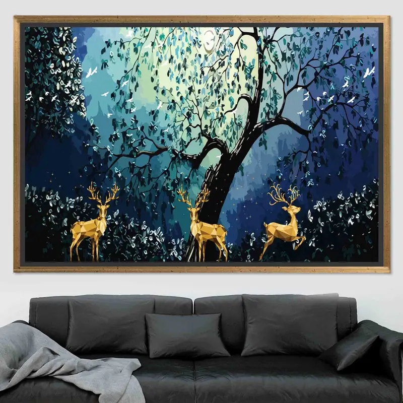 Luxury Deer Canvas: Gold Abstract Forest Night Landscape