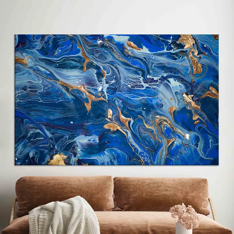 Luxurious Navy Blue Shimmery Gold Printed Canvas Art