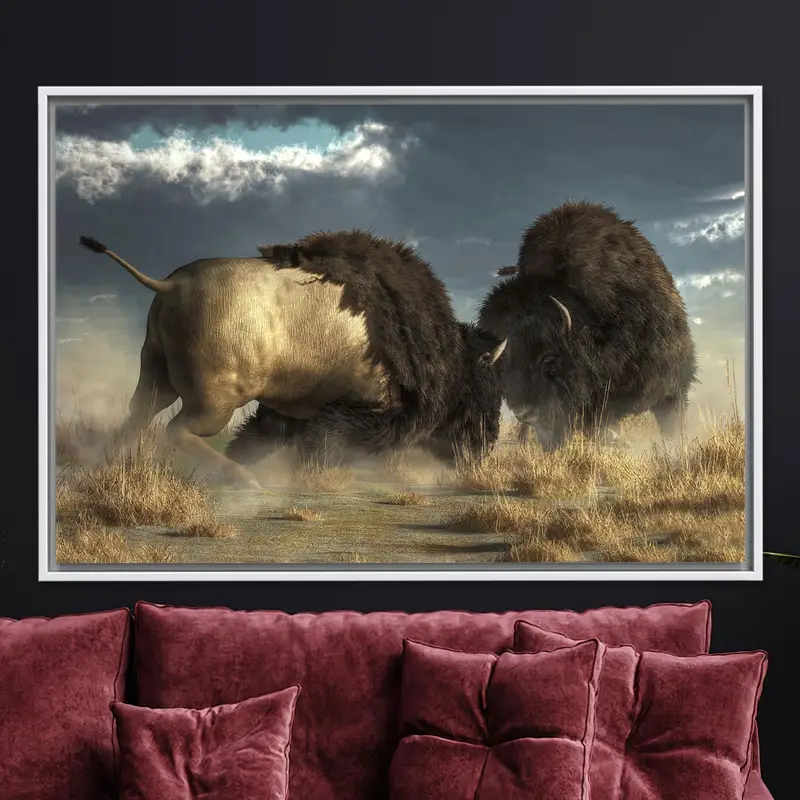Majestic Bison Battle Canvas: Wild Nature Art Print