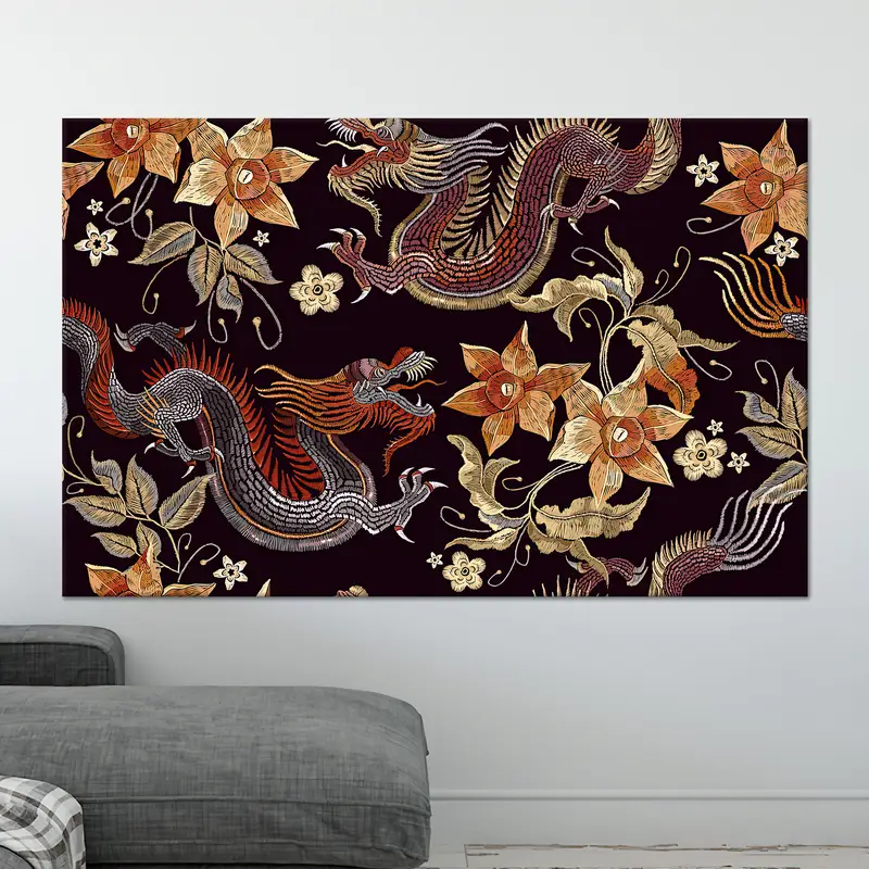 Elegant Myth Dragon Canvas: Japanese Pattern & Floral Fusion