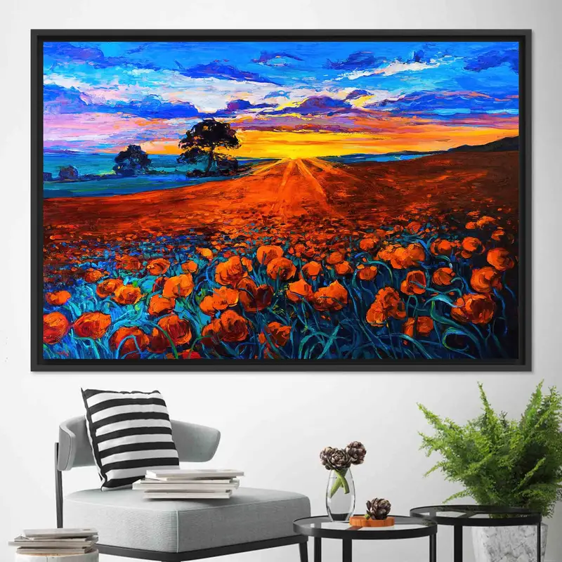Elegant Sunset Landscape Canvas: Red Flowers & Opium Poppies