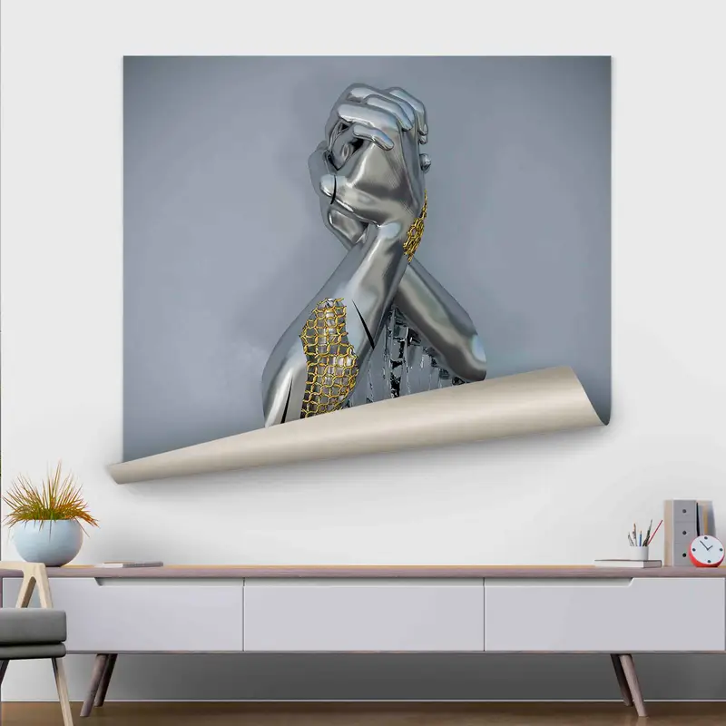 Contemporary Metallic Hand Printed Canvas with 3D Silver Effect