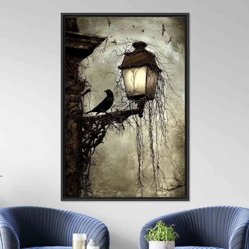 Enchanting Night Landscape Crow Street Lamp Canvas Print