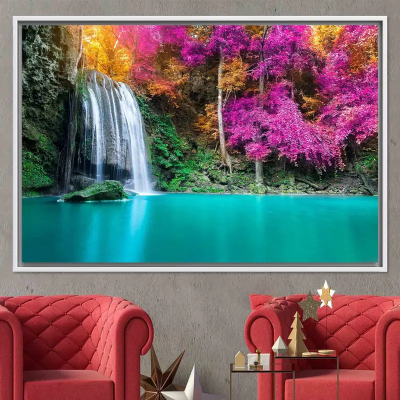 Elegant Purple Trees Waterfall Canvas Print - Lake View