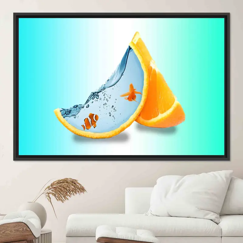Trendy Abstract Aquarium Canvas: Vibrant Two Orange Slices & Fish