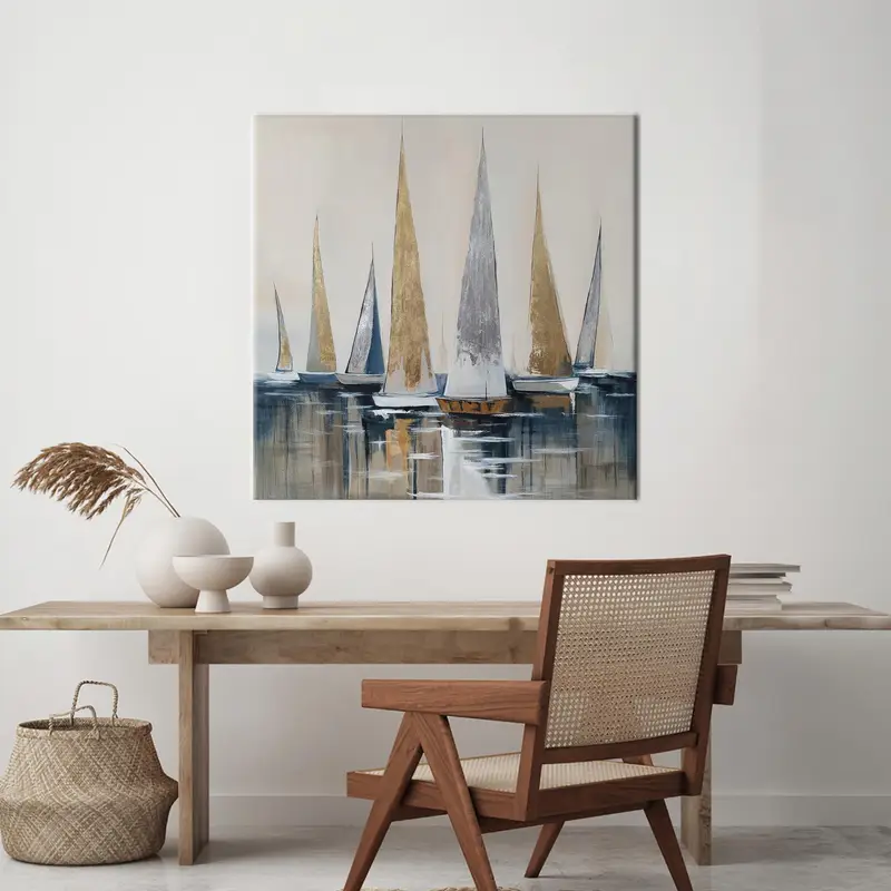 Golden Abstract Sea Boat Canvas: Elegant Printed Art Decor