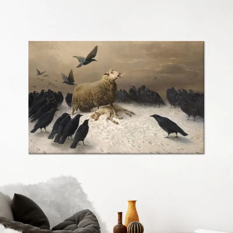 Elegant Canvas Art: August Friedrich's Majestic Crow & Sheep