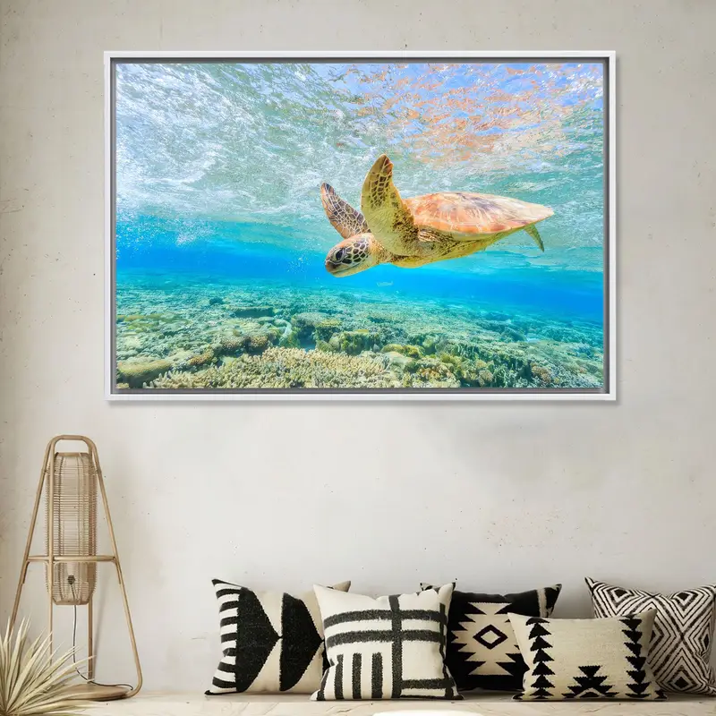 Oceanic Turtle Swim: Printed Canvas Art in Ocean Blue