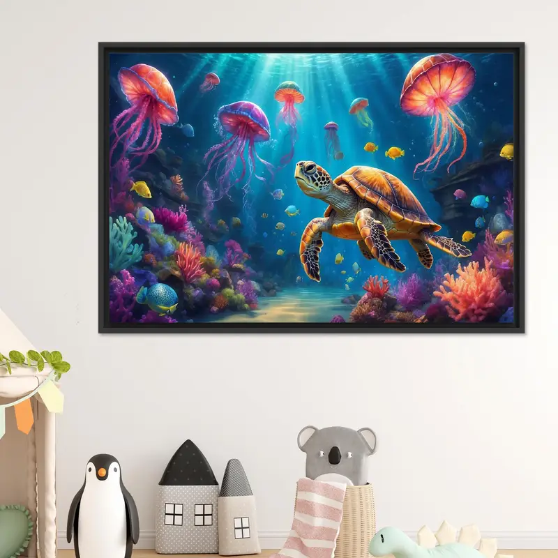 Elegant Seascape Canvas: Jellyfish, Sea Turtle, Corals Art Print
