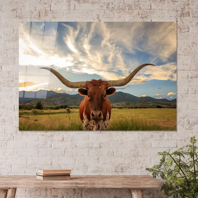 Elegant Longhorn Canvas: Mountain Sky Farm Landscape Print