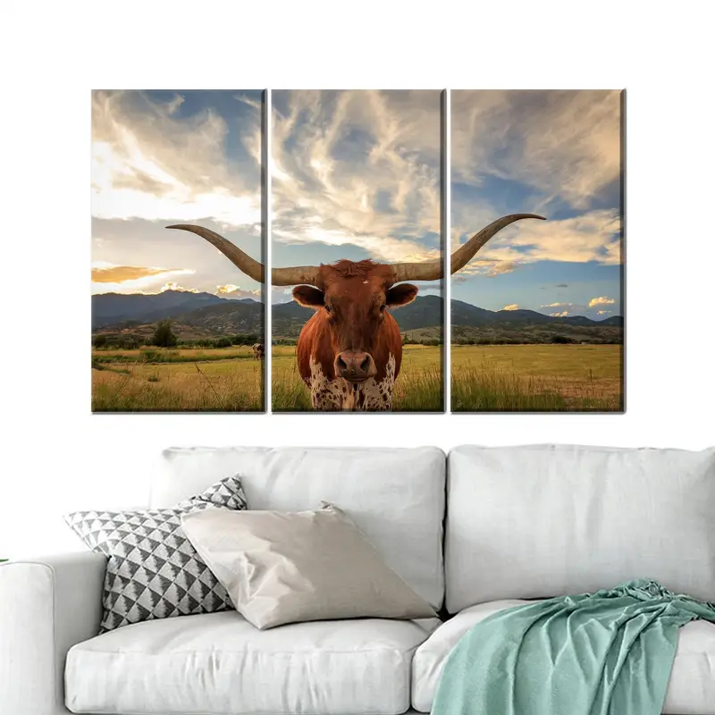 Elegant Longhorn Canvas: Mountain Sky Farm Landscape Print