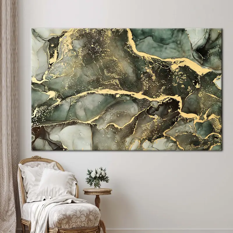 Luxury Marble Printed Canvas: Contemporary Green & Gold Shimmery Art