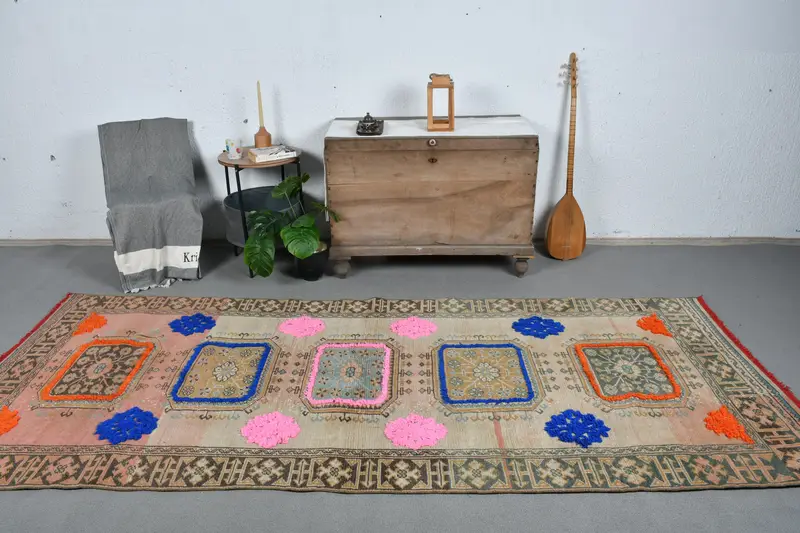 Elegant Beige & Pink Rug, 4.2x10 ft Polka Dot Design
